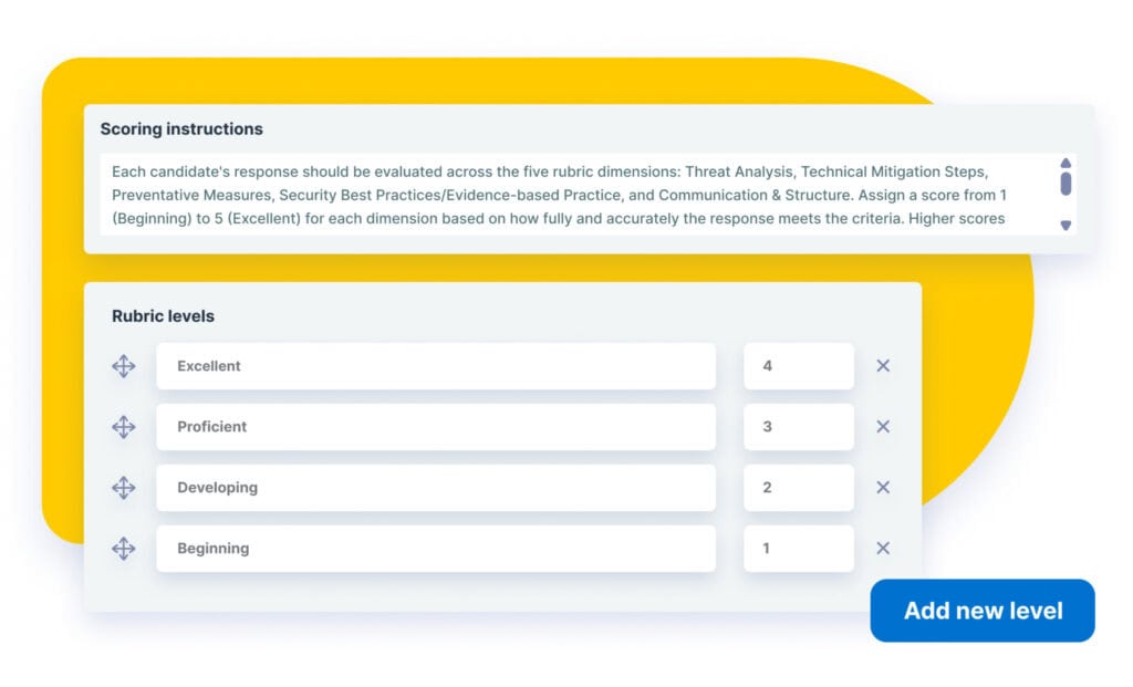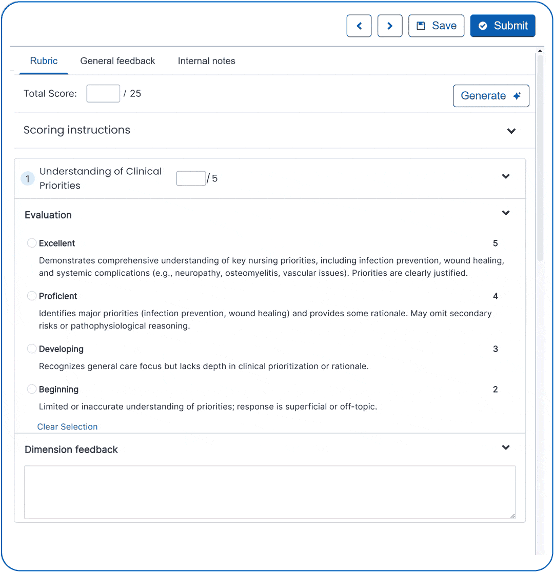 Rubric-aligned and able to adapt to a range of use cases and levels of complexity, AI Scoring generates intelligent scoring suggestions from long-form written responses based on your specific criteria. Scorers can then review each AI-generated score, make adjustments as needed, and submit the final results. By combining the speed and consistency of AI with human judgment, AI Scoring enables faster learner feedback, reduces SME workload, and paves the way for more scalable learning programs.